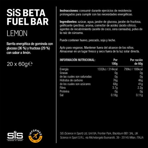 Caja SIS Barra Beta Fuel Energy Chew Limón 60g 20U