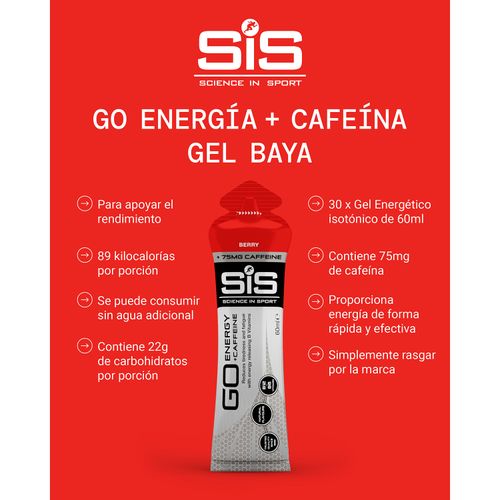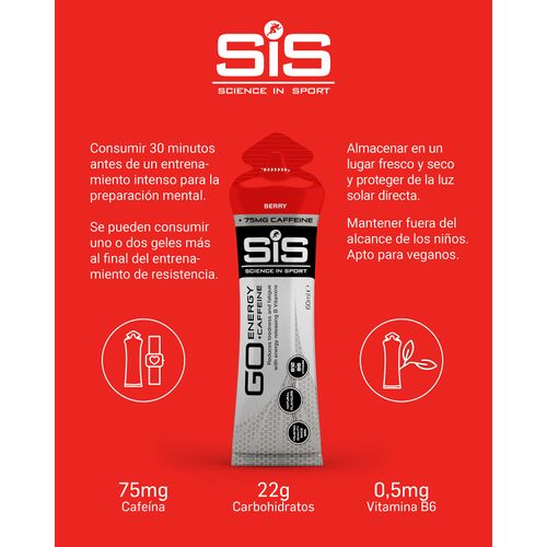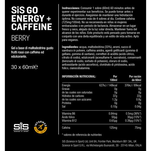 Go Energy + Caffeine Gel es un gel de energía diseñado para una competencia de alta intensidad que proporciona carbohidratos de absorción rápida y fácilmente digerible junto con cafeína. Combinados, los dos ingredientes le dan un enfoque físico y mental cuando lo necesita. SIS Go Energy + Caffeine Gel le da un impulso de energía mental y física antes o durante el ejercicio. Están diseñados para eventos de resistencia largos y difíciles cuando está marcando y necesita una ventaja porque el agotamiento de los carbohidratos es una causa importante de fatiga durante el ejercicio. Limpio en la boca, los geles son fáciles de digerir y llevar contigo. Los 22 gramos de carbohidratos en GO Energy + Gel de cafeína le dan un aumento rápido de energía que le ayuda a lograr el punto de referencia de 60-90 g por hora de carbohidratos para mantener y mejorar el rendimiento. Esto, más la adición de 75 mg de cafeína, que ha demostrado repetidamente mejorar el rendimiento al reducir su percepción de esfuerzo, le brinda un impulso muy necesario durante el ejercicio de resistencia. GO Energy + Caffeine Gel se puede consumir 30 minutos antes del ejercicio intenso para la preparación mental. Se pueden consumir uno o dos geles más hacia el final de su período de ejercicio de resistencia cuando siente que necesita un impulso físico o para mejorar la alerta y la concentración. Simplemente arrance la parte superior del bolsillo y aprieta el gel directamente en su boca. Al presionarte con fuerza, tu cerebro controla lo fatigado que te sientes. La cafeína actúa como un estimulante en el cerebro para reducir su percepción de esfuerzo, lo que le permite seguir empujando y tal vez estirarse un poco más. Puede tomar 30-60 minutos después del consumo para que los niveles de cafeína alcanzaran su punto máximo en la sangre, por lo que si está haciendo un evento de corta duración (menos de 60 minutos), debe tomarlo antes de comenzar. Si está haciendo un evento mucho más largo, como un maratón, un triatlón deportivo de 100 millas o un triatlón de medio hierro o más, debe ahorrar su ingesta de cafeína durante las últimas dos horas cuando es probable que su nivel de fatiga te alcance. Adecuado para: veganos, vegetarianos, sin lactosa, sin gluten, sin trigo, sin nueces, sin soja GO Energy + Caffeine Gel se puede consumir 30 minutos antes del ejercicio intenso para la preparación mental. Se pueden consumir uno o dos geles más hacia el final de su período de ejercicio de resistencia cuando siente que necesita un impulso físico o para mejorar la alerta y la concentración. Simplemente arrance la parte superior del bolsillo y aprieta el gel directamente en su boca.