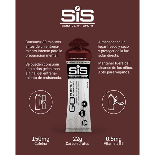 Go Energy + Caffeine Gel es un gel de energía diseñado para una competencia de alta intensidad que proporciona carbohidratos de absorción rápida y fácilmente digerible junto con cafeína. Combinados, los dos ingredientes le dan un enfoque físico y mental cuando lo necesita. SIS Go Energy + Caffeine Gel le da un impulso de energía mental y física antes o durante el ejercicio. Están diseñados para eventos de resistencia largos y difíciles cuando está marcando y necesita una ventaja porque el agotamiento de los carbohidratos es una causa importante de fatiga durante el ejercicio. Limpio en la boca, los geles son fáciles de digerir y llevar contigo. Los 22 gramos de carbohidratos en GO Energy + Gel de cafeína le dan un aumento rápido de energía que le ayuda a lograr el punto de referencia de 60-90 g por hora de carbohidratos para mantener y mejorar el rendimiento. Esto, más la adición de 75 mg de cafeína, que ha demostrado repetidamente mejorar el rendimiento al reducir su percepción de esfuerzo, le brinda un impulso muy necesario durante el ejercicio de resistencia. GO Energy + Caffeine Gel se puede consumir 30 minutos antes del ejercicio intenso para la preparación mental. Se pueden consumir uno o dos geles más hacia el final de su período de ejercicio de resistencia cuando siente que necesita un impulso físico o para mejorar la alerta y la concentración. Simplemente arrance la parte superior del bolsillo y aprieta el gel directamente en su boca. Al presionarte con fuerza, tu cerebro controla lo fatigado que te sientes. La cafeína actúa como un estimulante en el cerebro para reducir su percepción de esfuerzo, lo que le permite seguir empujando y tal vez estirarse un poco más. Puede tomar 30-60 minutos después del consumo para que los niveles de cafeína alcanzaran su punto máximo en la sangre, por lo que si está haciendo un evento de corta duración (menos de 60 minutos), debe tomarlo antes de comenzar. Si está haciendo un evento mucho más largo, como un maratón, un triatlón deportivo de 100 millas o un triatlón de medio hierro o más, debe ahorrar su ingesta de cafeína durante las últimas dos horas cuando es probable que su nivel de fatiga te alcance. Adecuado para: veganos, vegetarianos, sin lactosa, sin gluten, sin trigo, sin nueces, sin soja GO Energy + Caffeine Gel se puede consumir 30 minutos antes del ejercicio intenso para la preparación mental. Se pueden consumir uno o dos geles más hacia el final de su período de ejercicio de resistencia cuando siente que necesita un impulso físico o para mejorar la alerta y la concentración. Simplemente arrance la parte superior del bolsillo y aprieta el gel directamente en su boca.