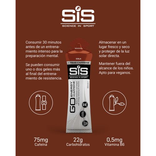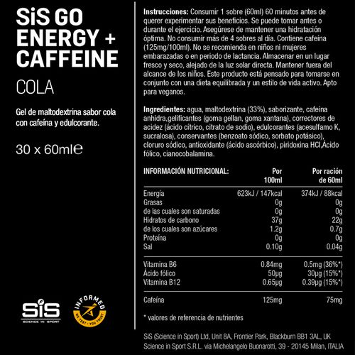 Go Energy + Caffeine Gel es un gel de energía diseñado para una competencia de alta intensidad que proporciona carbohidratos de absorción rápida y fácilmente digerible junto con cafeína. Combinados, los dos ingredientes le dan un enfoque físico y mental cuando lo necesita. SIS Go Energy + Caffeine Gel le da un impulso de energía mental y física antes o durante el ejercicio. Están diseñados para eventos de resistencia largos y difíciles cuando está marcando y necesita una ventaja porque el agotamiento de los carbohidratos es una causa importante de fatiga durante el ejercicio. Limpio en la boca, los geles son fáciles de digerir y llevar contigo. Los 22 gramos de carbohidratos en GO Energy + Gel de cafeína le dan un aumento rápido de energía que le ayuda a lograr el punto de referencia de 60-90 g por hora de carbohidratos para mantener y mejorar el rendimiento. Esto, más la adición de 75 mg de cafeína, que ha demostrado repetidamente mejorar el rendimiento al reducir su percepción de esfuerzo, le brinda un impulso muy necesario durante el ejercicio de resistencia. GO Energy + Caffeine Gel se puede consumir 30 minutos antes del ejercicio intenso para la preparación mental. Se pueden consumir uno o dos geles más hacia el final de su período de ejercicio de resistencia cuando siente que necesita un impulso físico o para mejorar la alerta y la concentración. Simplemente arrance la parte superior del bolsillo y aprieta el gel directamente en su boca. Al presionarte con fuerza, tu cerebro controla lo fatigado que te sientes. La cafeína actúa como un estimulante en el cerebro para reducir su percepción de esfuerzo, lo que le permite seguir empujando y tal vez estirarse un poco más. Puede tomar 30-60 minutos después del consumo para que los niveles de cafeína alcanzaran su punto máximo en la sangre, por lo que si está haciendo un evento de corta duración (menos de 60 minutos), debe tomarlo antes de comenzar. Si está haciendo un evento mucho más largo, como un maratón, un triatlón deportivo de 100 millas o un triatlón de medio hierro o más, debe ahorrar su ingesta de cafeína durante las últimas dos horas cuando es probable que su nivel de fatiga te alcance. Adecuado para: veganos, vegetarianos, sin lactosa, sin gluten, sin trigo, sin nueces, sin soja GO Energy + Caffeine Gel se puede consumir 30 minutos antes del ejercicio intenso para la preparación mental. Se pueden consumir uno o dos geles más hacia el final de su período de ejercicio de resistencia cuando siente que necesita un impulso físico o para mejorar la alerta y la concentración. Simplemente arrance la parte superior del bolsillo y aprieta el gel directamente en su boca.