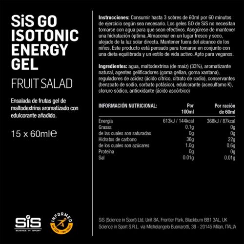 MATERIAL Cada bolsita de gel isotónica de GO Energy contiene 22 gramos de carbohidratos. Dependiendo de su deporte o evento, debe tratar de consumir 1-3+ geles cada hora para alcanzar una ingesta de objetivo de 60 g-90 g. En algunas circunstancias, como el clima frío, puede ser necesario consumir más. Tire de la parte superior del empaque y exprima el contenido en la boca cuando sea necesario.