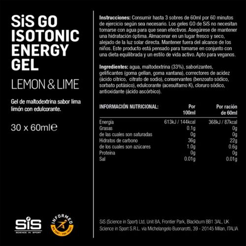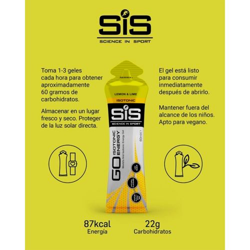 | TECNOLOGÍA | La fórmula isotónica permite que el gel se vacíe rápidamente del estómago, ya que no es necesario atraer ningún líquido a su estómago para diluir el gel, proporcionando energía rápida. Los geles de energía isotónica de SIS Go son muy prácticos y se pueden transportar fácilmente sin el requisito de botellas voluminosas. |