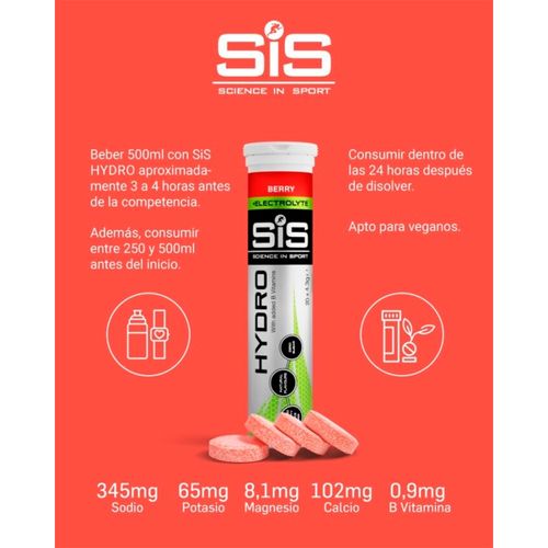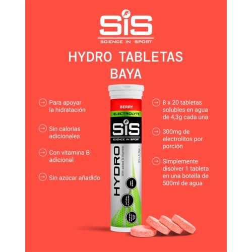 SIS GO HYDRO SiS GO Hydro está diseñado para garantizar que esté hidratado de manera efectiva para producir su mejor rendimiento. Como tableta efervescente que se disuelve fácilmente en agua pura, representa un enfoque muy práctico (simplemente coloque una tableta en su botella de agua de 500 ml) sin las calorías. SiS GO Hydro cumple con sus requisitos de sodio en una concentración específica (30 mmol / L) que está científicamente comprobado que produce una hidratación superior en comparación con el agua sola. Fue desarrollado para mantener al equipo británico de vela hidratado de manera óptima en los Juegos Olímpicos de Beijing 2008. Simplemente deje caer una tableta en agua para una hidratación efectiva, prácticamente sin calorías, antes y durante los deportes.