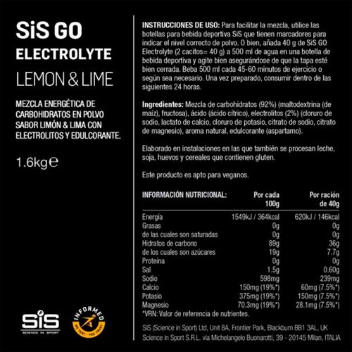 Suministro rápido y fácil de digerir de carbohidratos y electrolitos que promueven una hidratación y energía óptimas, lo que lo convierte en el complemento perfecto para usar durante el ejercicio. Una combinación de fuentes de energía y electrolitos mejora la capacidad de su cuerpo para absorber agua durante el ejercicio, mantener su rendimiento de resistencia y protegerlo contra los calambres. Este producto es apto para cualquier persona que siga una dieta vegana, además de estar libre de gluten, trigo y nueces. La gama completa de productos se desarrolla utilizando un enfoque de clase mundial para las pruebas de sustancias prohibidas, lo que brinda seguridad a los atletas, así como a aquellos que solo están preocupados por la seguridad de los componentes de sus productos favoritos.